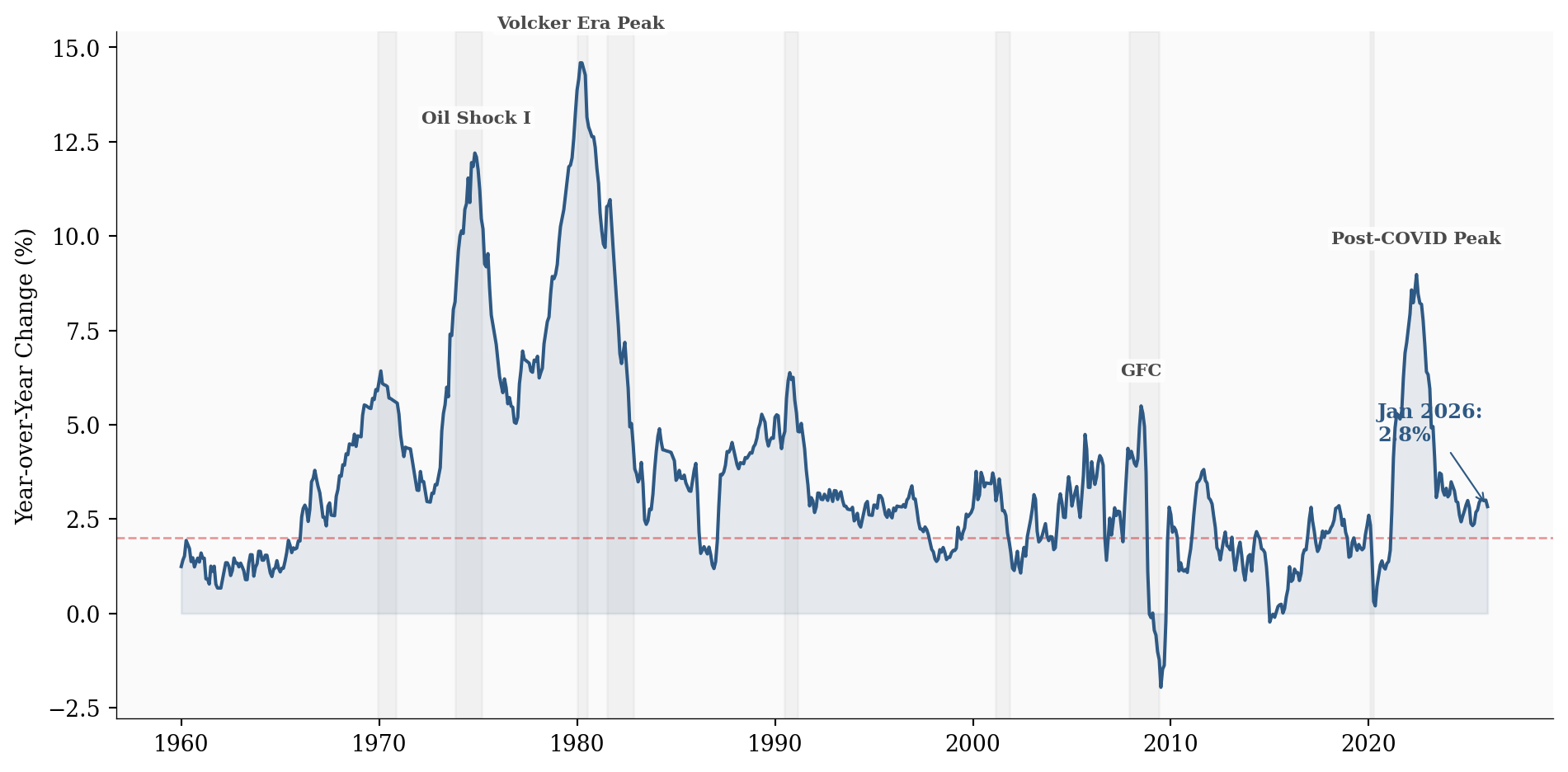 In historical context, 2.8% is utterly unremarkable. The long-run average since 1960 is 3.7%, and the post-COVID spike of 14.6% in March 1980 now looks like an acute episode, not a regime change. The “Great Moderation” of inflation that characterized the 1990s-2010s appears to be reasserting itself.