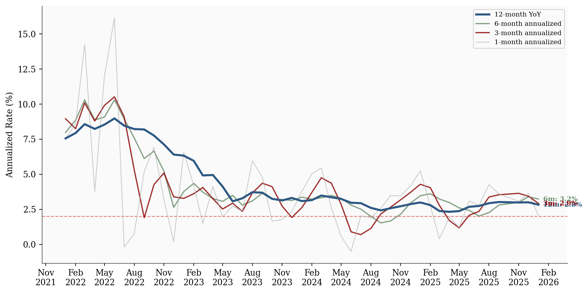 The 3-month annualized rate is 2.9%, which is 0.1pp above the 12-month rate. This suggests near-term price pressures are running hotter than the trailing average.