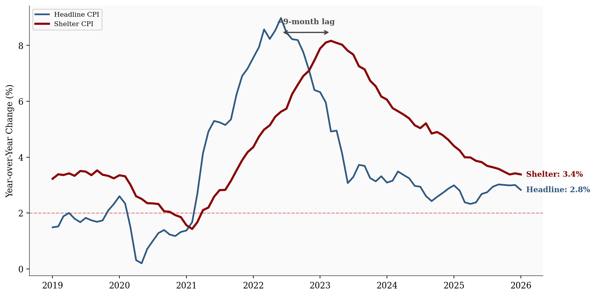The chart above makes the lag crystal clear: headline CPI peaked months before shelter CPI did. The BLS shelter measure reflects the average rent across all existing leases, not just new ones — so it takes 12-18 months for market-rate changes to fully flow through.