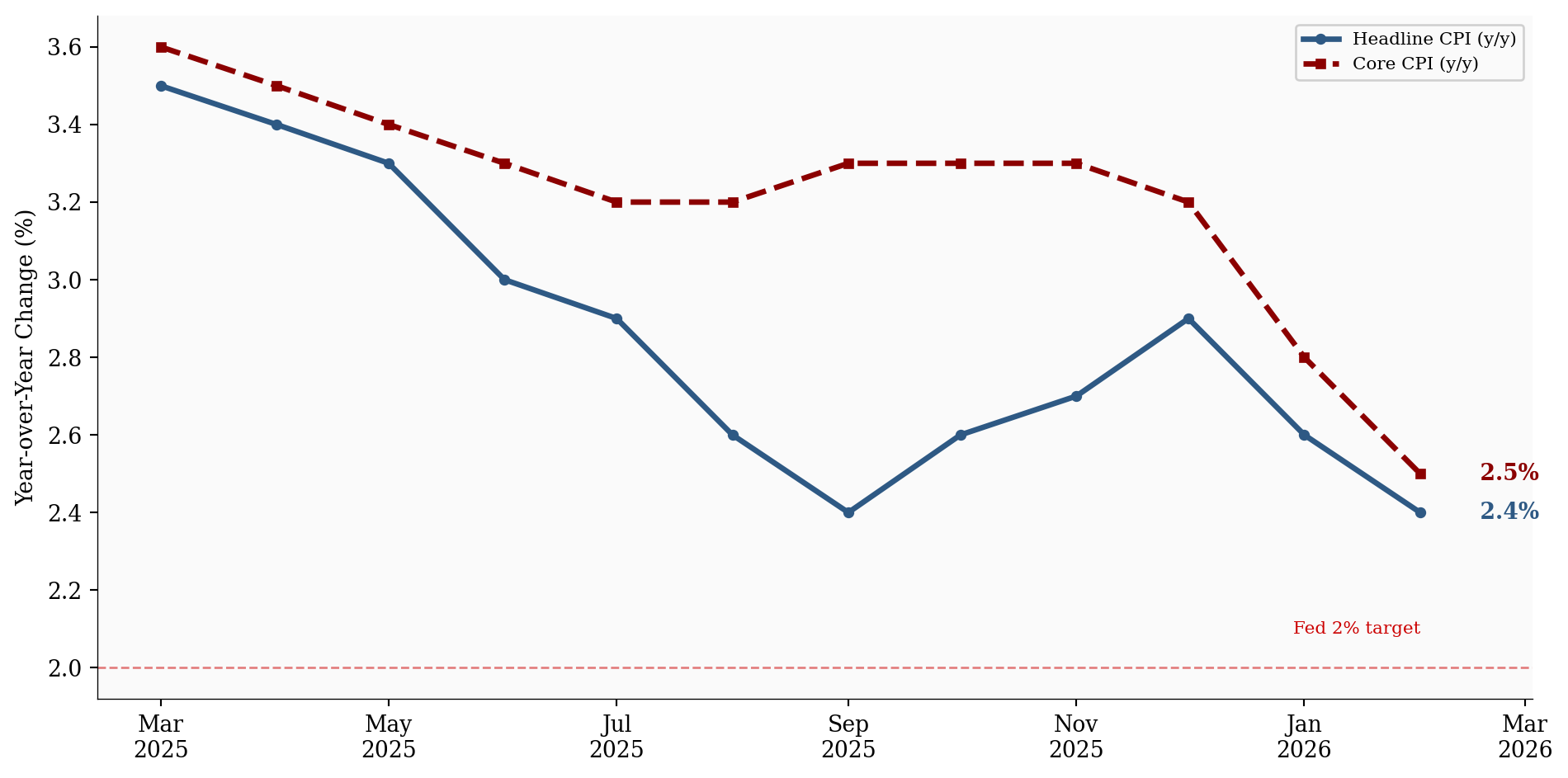 The third release complicates the picture further. Headline CPI for February 2026 came in at 2.4% year-over-year. Core CPI, stripping out food and energy, landed at 2.5%. Both are lower than last year’s readings, but neither is at the Fed’s 2% target.