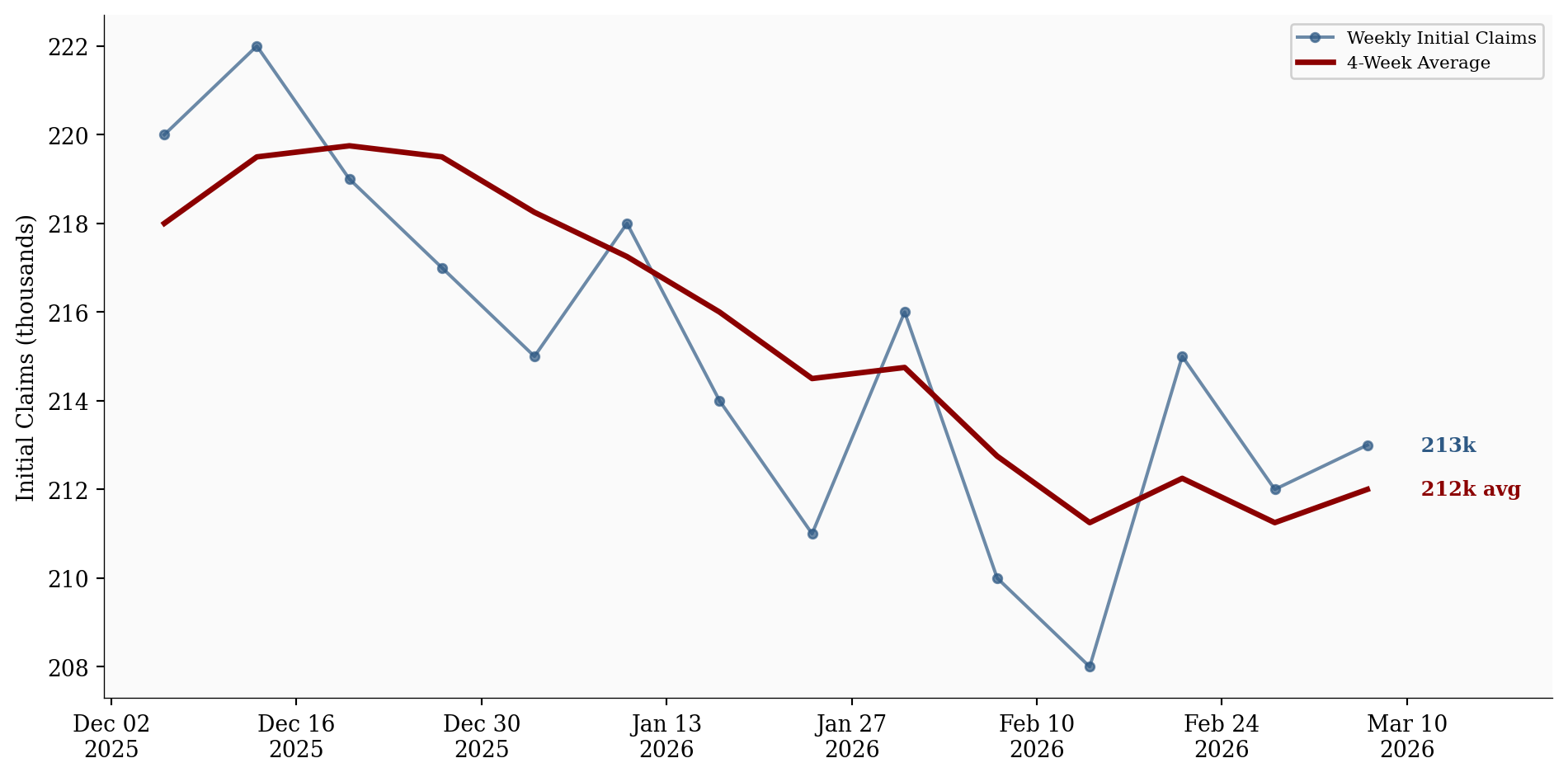 Initial claims for the week ending March 7 came in at 213,000, with the four-week moving average at 212,000. Both figures remain near historically low levels. The claims data has been remarkably stable for months, showing no sign of the kind of layoff acceleration that typically accompanies a deteriorating labor market.