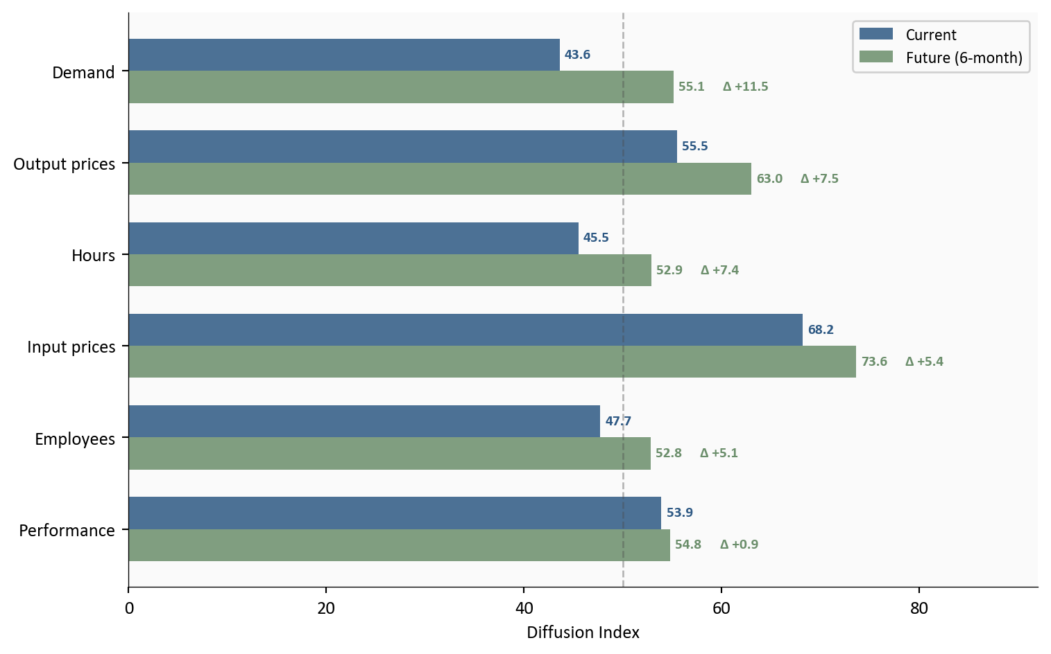 The chart is sorted by the size of the gap between current and future readings, and every indicator shows a meaningful disconnect. Output prices show the largest delta: businesses currently report modest price increases (55.5), but expect to raise prices significantly over the next six months (63.0). The signal is clear: pass-through pricing is coming. Demand tells a similar story in the opposite direction. Current demand sits at 43.6, well into contraction, but businesses expect it to recover to 55.1 over the next two quarters.