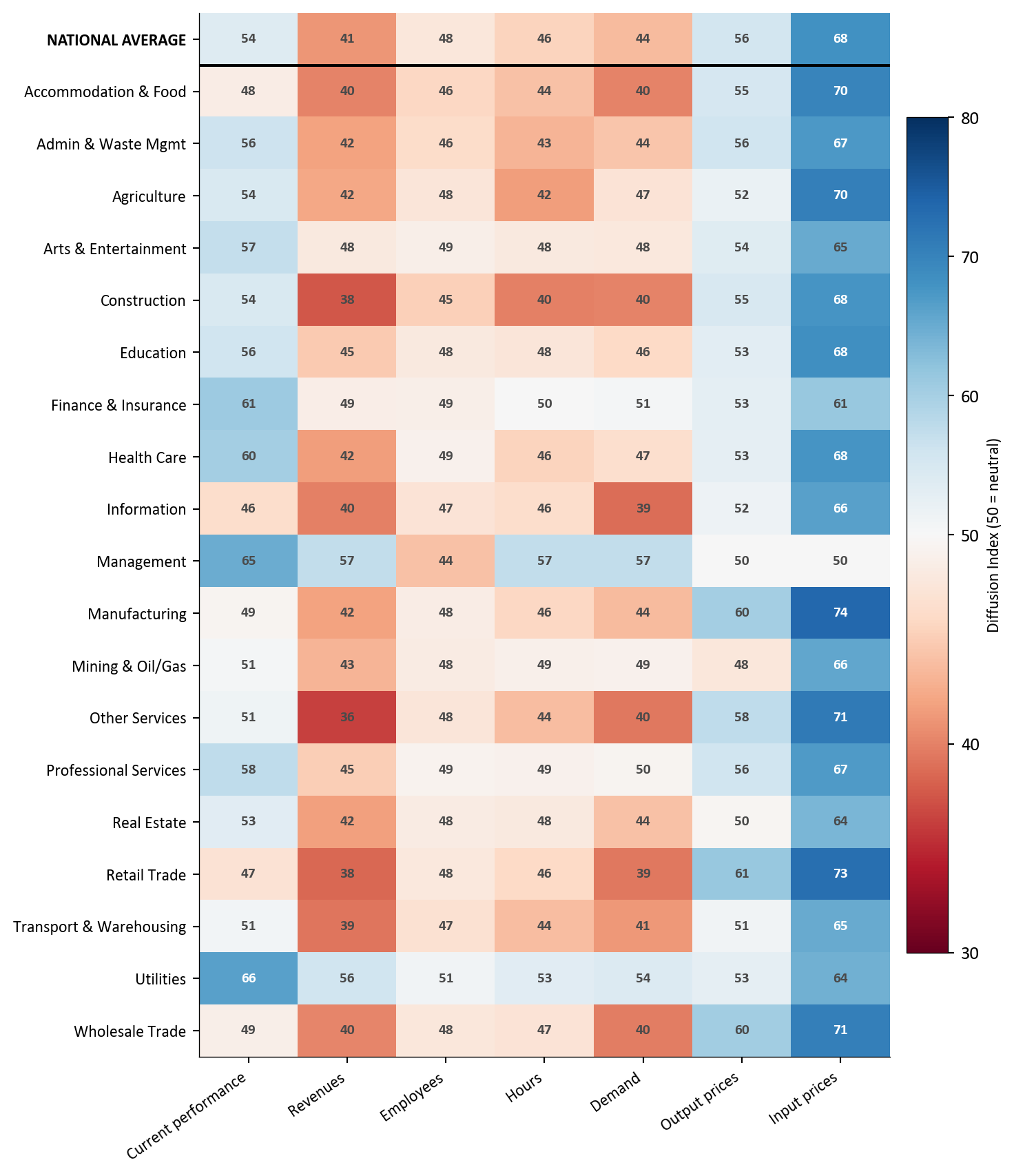 The heatmap reveals a consistent pattern: input prices are elevated across nearly every sector, while revenues and employees are broadly below neutral. Construction, manufacturing, and wholesale trade face the sharpest cost-hiring squeeze, where input costs run well above 50 while employee counts contract. The few sectors with employee indexes near or above 50 tend to be service-oriented, consistent with the broader narrative of services-led resilience.