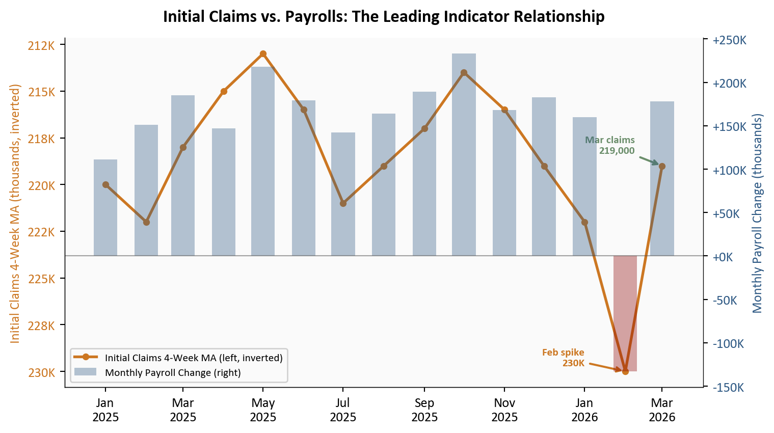 - The initial claims series used in the overlay chart (Section 4) uses monthly averages of the weekly 4-week moving average, an approximation for alignment with monthly payroll data. The underlying weekly series is available in the March 29 post.