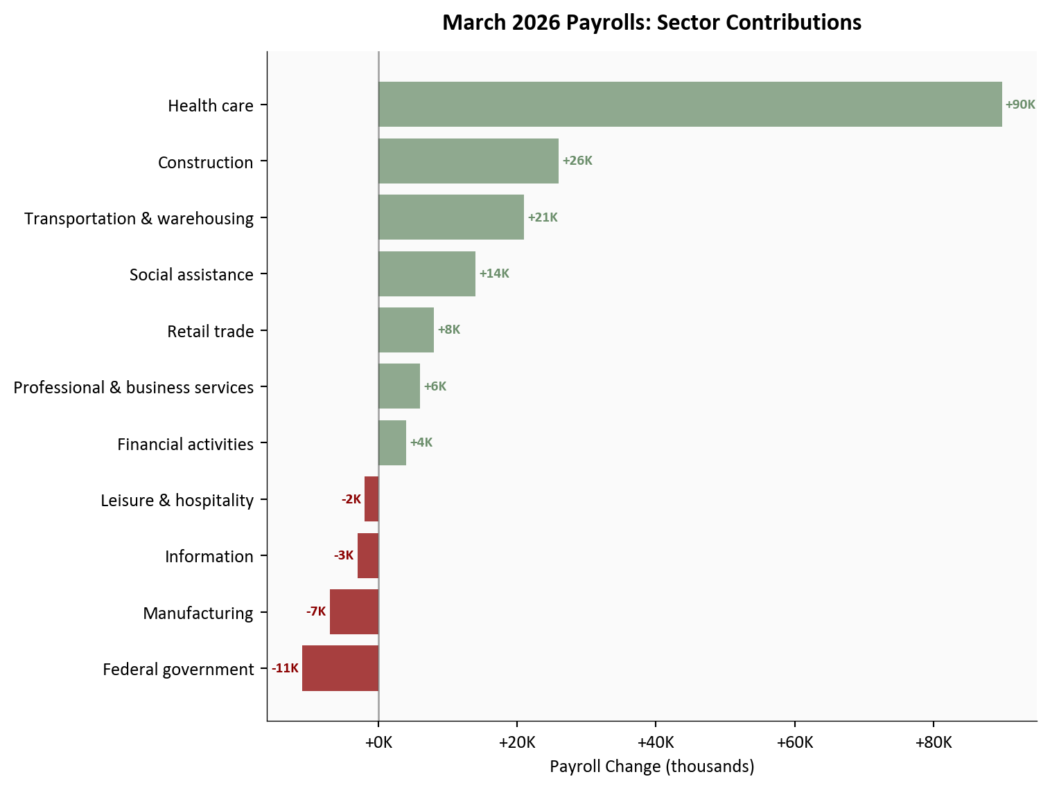 ax.set_title("March 2026 Payrolls: Sector Contributions",