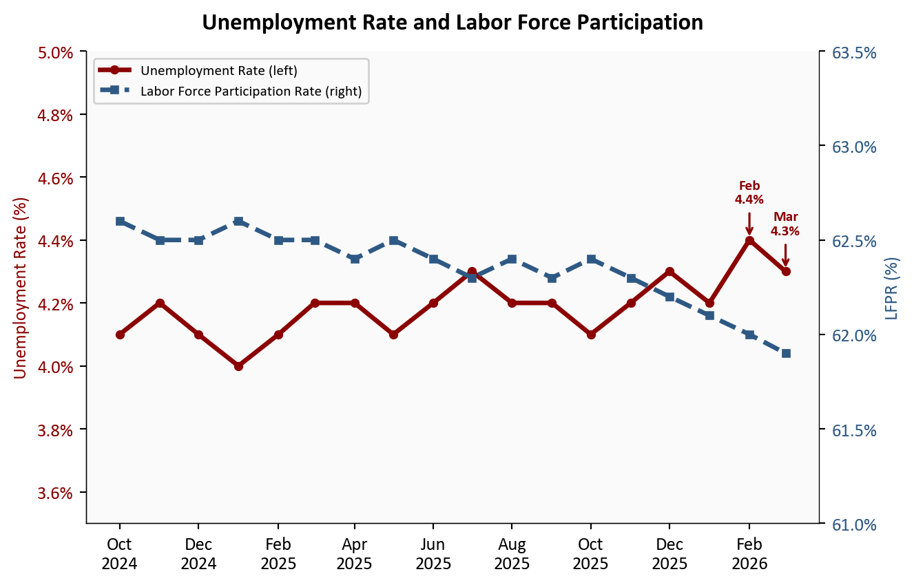 The dual-axis view makes the divergence visible. The unemployment rate has bounced in a narrow band between 4.0% and 4.4% since early 2025, with no clear deteriorating trend. The LFPR, meanwhile, has drifted lower: from a recent peak around 62.6% in late 2024 to 61.9% in March. The two series together describe a labor market where fewer people are being laid off, but also where fewer are actively entering or re-entering the workforce. That is a different kind of softening than the headline unemployment rate alone captures - and it is a more consequential one over the longer run.