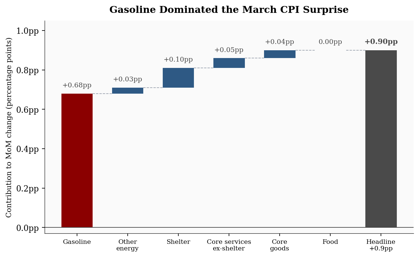 ax.set_title("Gasoline Dominated the March CPI Surprise", fontsize=12, fontweight="bold", pad=10)