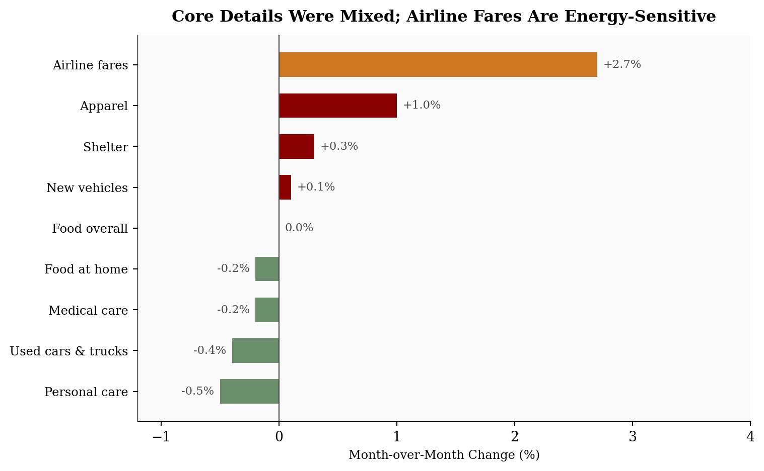 ax.set_title("Core Details Were Mixed; Airline Fares Are Energy-Sensitive", fontsize=12, fontweight="bold", pad=10)