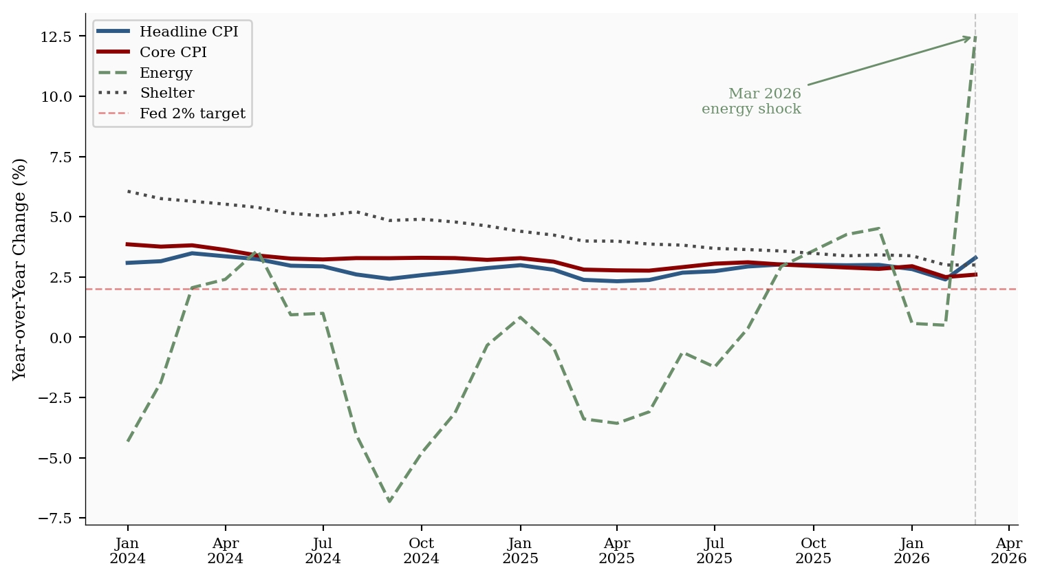 This chart separates the noisy headline series from the slower-moving core and shelter trends. The key reader question is whether March changed the underlying inflation path; plotting the year-over-year series makes that easier to see.